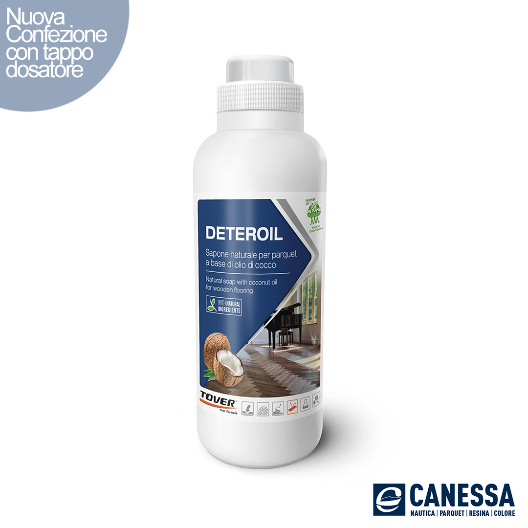 Deteroil è il sapone naturale per la pulizia di parquet oliati, anche colorati. Certificato A+, a basso impatto ambientale, formulato con tensioattivi a base di sapone di cocco, deterge e nutre il legno in profondità. Disponibile anche bianco.